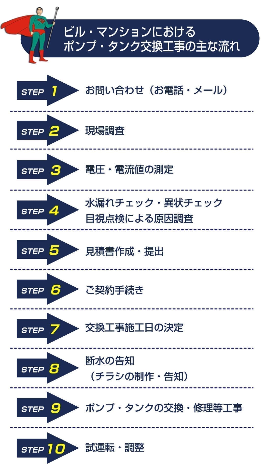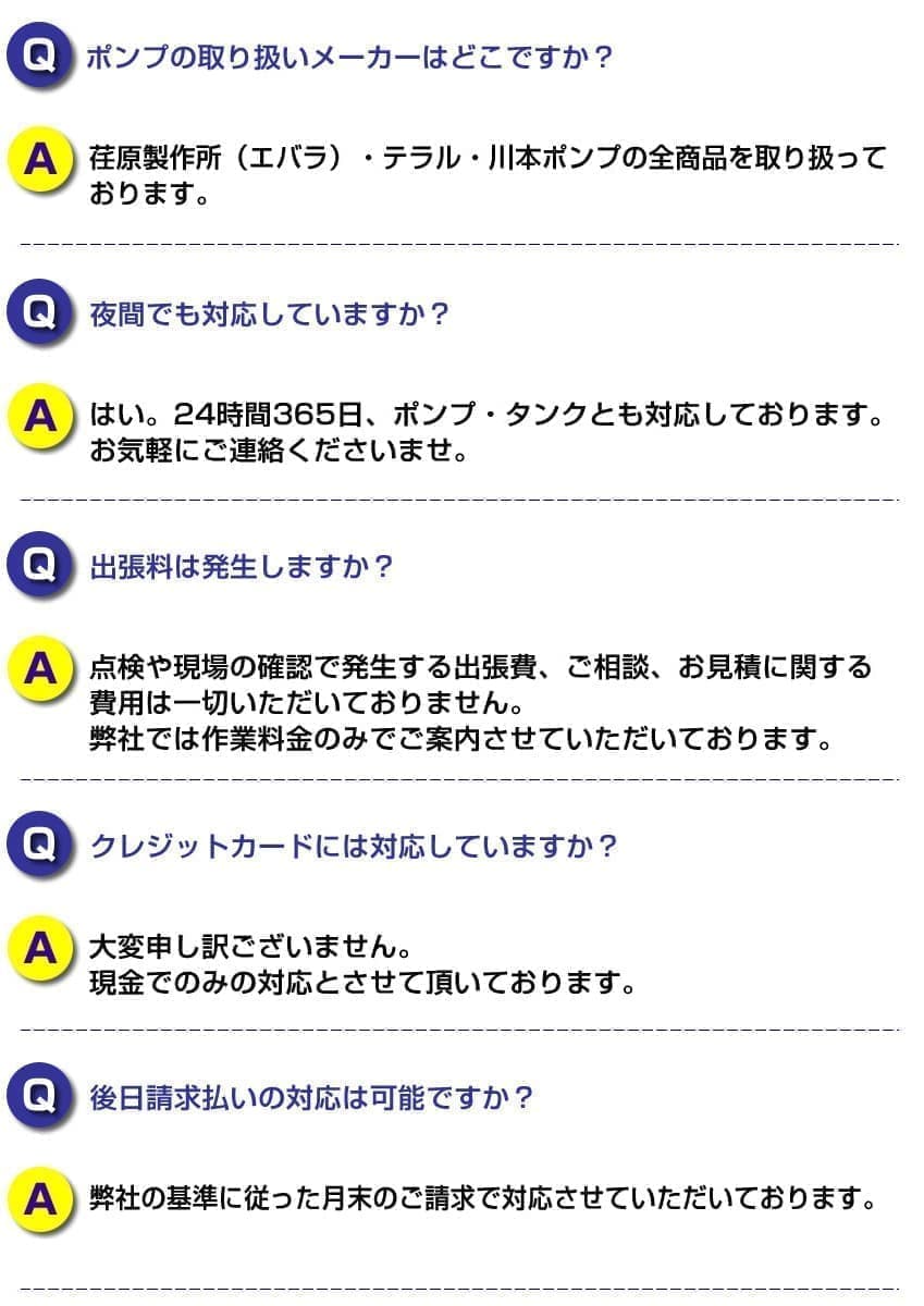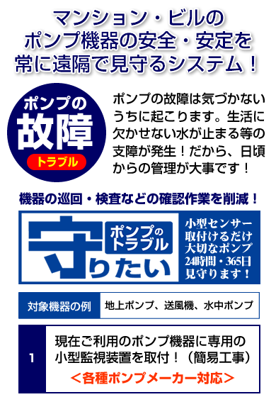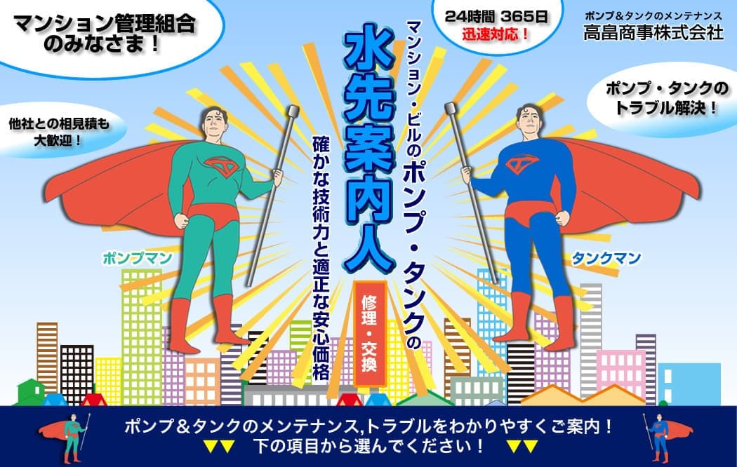 | 事業内容 | 給排水ポンプ/受水槽の修理・交換・点検、受水槽清掃、屋上防水、塗装工事、消防点検 等、マンション共用部分の設備工事・点検の各種サービス